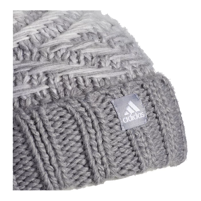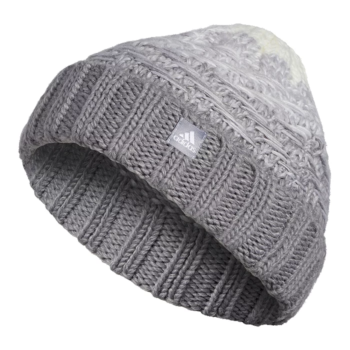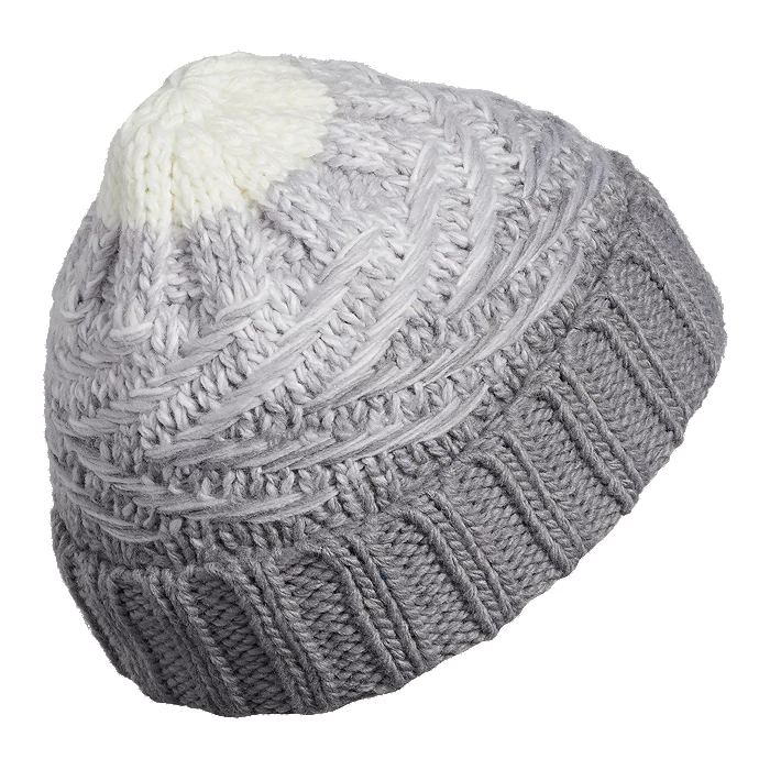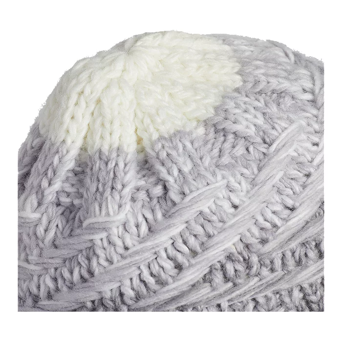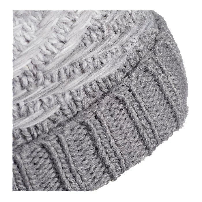 Bundle up on a cold day with this warm beanie. It has a chunky cable pattern knit from soft yarn with a transitional color pattern.