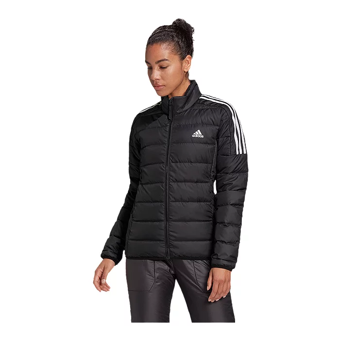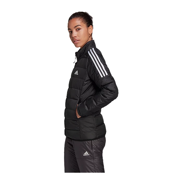 Online Only. Enjoy the lightweight warmth of down in the adidas Essentials Down Jacket. Down baffles seal in the heat. Classic 3-Stripes details lend it street style. It’s made of recycled materials, one important step toward adidas’ goal to end plastic waste.