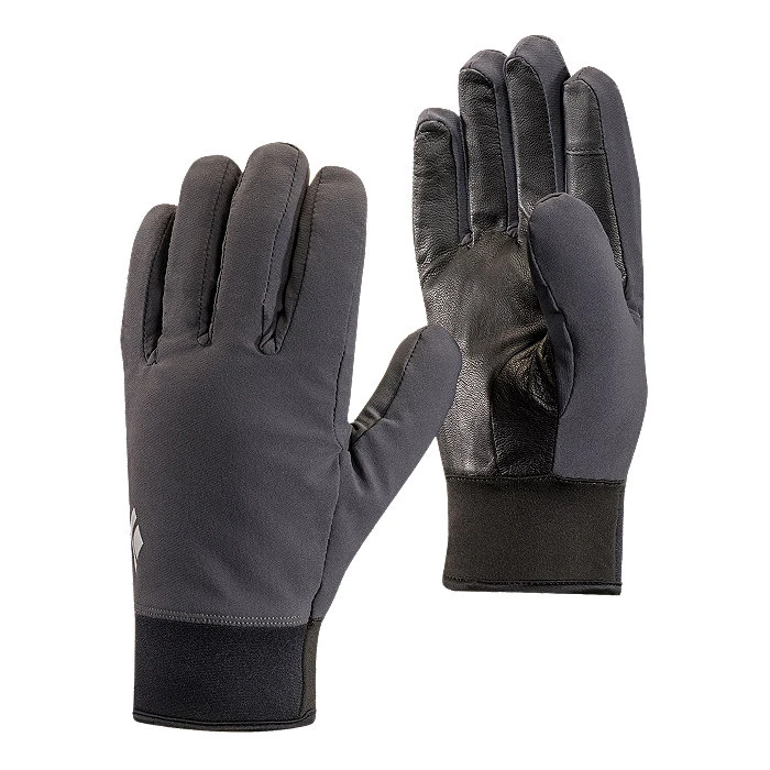 Built with durable, stretchy and weather-resistant softshell fabric for high-output pursuits in mild conditions, the Black Diamond MidWeight Softshell gloves offer dynamic, breathable protection while ski touring, climbing or backpacking. The full goat leather palms and fingers offer a secure grip on poles or tools and feature digital material on the thumbs and index fingers allow for gloves-on touchscreen functionality. Comfortable, fleece-lined neoprene cuffs seal out the elements and make for easy on and off.