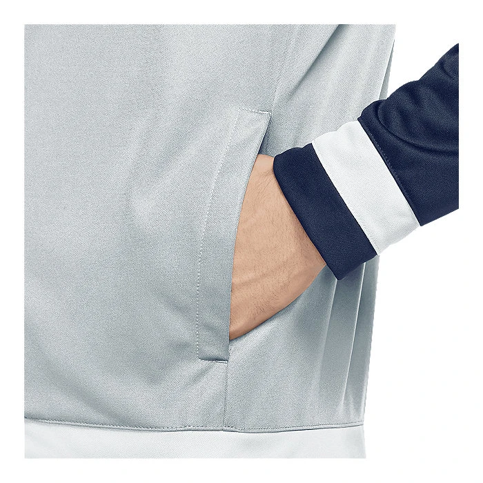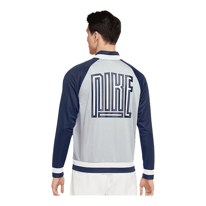 Bring the style of the game into your everyday life with the Nike Dri-FIT Jacket. Made from sporty, durable fabric, it’s got a varsity vibe with striped edges and raglan sleeves. The huge back graphic spells out “NIKE” in lettering inspired by Nike Basketball’s classic “Force” logo.