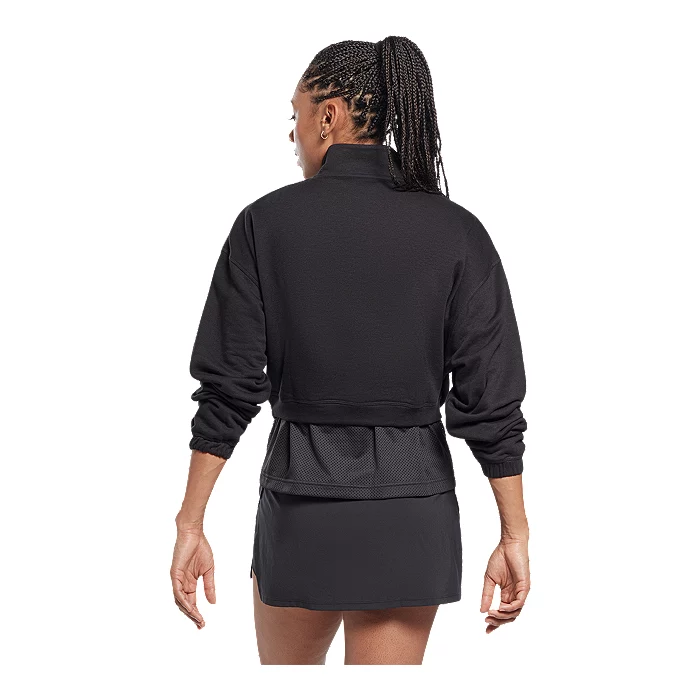 Layer this women’s Reebok sweatshirt over a tee and you’re all set for a trip to the gym, a walk with the dog or whatever the day has in store. The quarter-zip style is made in cozy French terry with a casual, loose fit. A stand-up collar fends off chill winds.