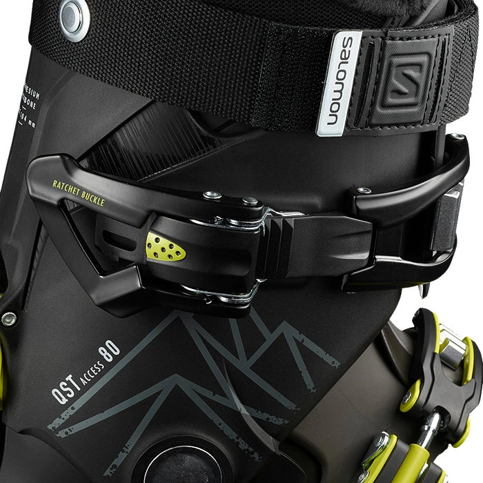 The Salomon QST Access 80 has a ratchet buckle for intuitive adjustment, making this easy walking boot convenient and comfortable for all-day skiing.